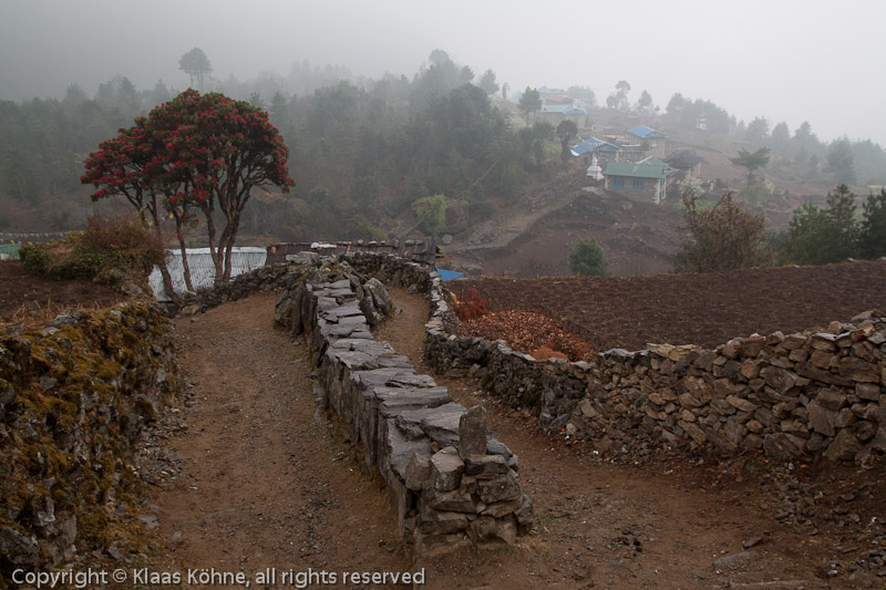 Bei Sonne und weniger Gepäck auf dem Rücken wäre das bestimmt eine schöne Wanderung, Vor gut sieben Stunden habe ich Namche verlassen und bin entsprechend müde. Zur allgemeinen Erschöpfung kommen jetzt auch noch Bauchschmerzen. Wo hab´ ich mir die denn geholt?