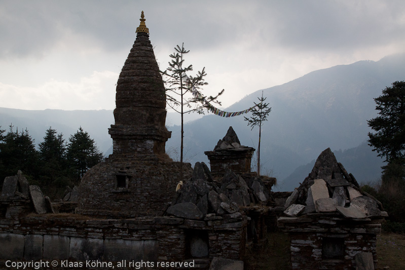 Zügig abwärts. Bis Junbesi werde ich heute nicht mehr kommen. Salung wird es wohl werden. Ein Fotostopp am "Khmer-Tempel" muss natürlich sein!