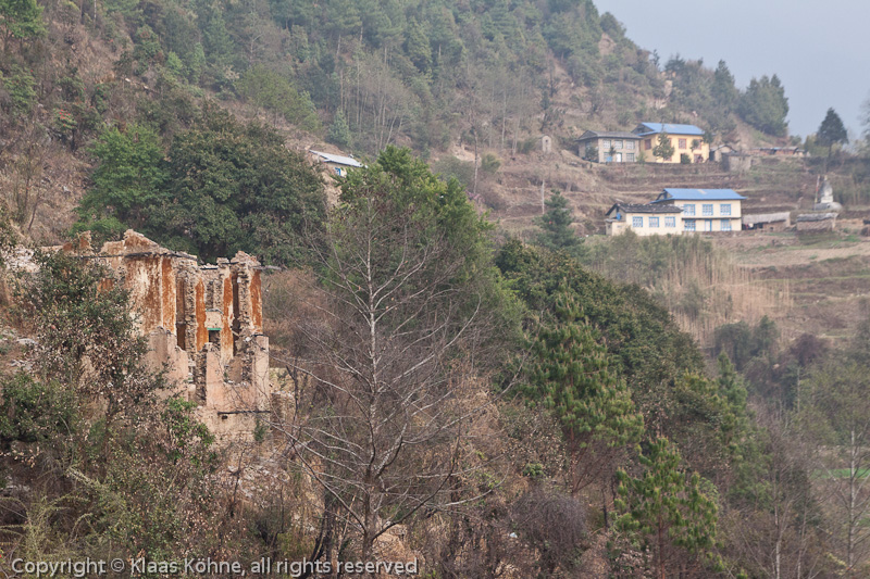 Bei einer Pause in Dagchu bietet mir ein etwa dreijähriges Mädchen in einem hübschen gelben Kleid ein paar geröstete Maiskörner an. Dafür bekommt es ein paar Erdnüsse. Die Mutter meint, dass es noch zwei Stunden bis Kinja sind. OK, für sie vielleicht. War jedenfalls nochmal eine schöne Begegnung. Nach Dagchu geht es von der Rippe runter nach Sete. Um zwanzig nach vier bin ich dort. So weit, so gut - aber es sind immer noch 900 Höhenmeter Abstieg bis Kinja.