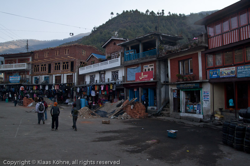 Dann rumpeln wir los. Das erste Ziel heißt Jiri. Nach etwa eineinhalb Stunden übelsten Geschaukels treffen wir ein. Habe mir schon ein paar schöne Beulen geholt. Und bis Kathmandu ist es noch weit...