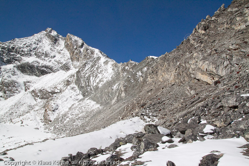 Sollte langsam in die Gänge kommen. Mist, die Schuhe sind mal wieder ziemliche Eisklumpen. Dauert ewig, bis ich drin bin. Außerdem sind die Häringe teilweise in den Boden eingefroren. So komme ich erst um zehn nach neun los. Zuerst geht es quer über einen gefrorenen See. Da oben rechts ist der Pass mit seinen Gebetsfahnen. Sieht ganz schön steil aus.