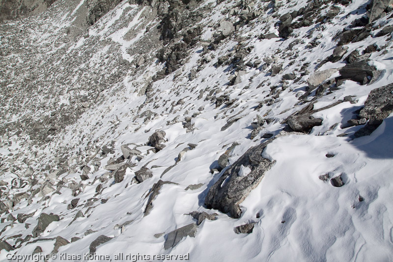 ... der nicht gerade einladend beginnt. Verschneites Blockwerk und ganz schön steil. Auch wenn die grobe Richtung zu erahnen ist, wird das kein Spaß, soviel ist klar! Leider habe ich den kleinen Daypack vor der Brust, so dass meine Bodensicht ziemlich eingeschränkt ist. Aber ich kann ja nicht den Rest meines Lebens hier oben verbringen, also los!