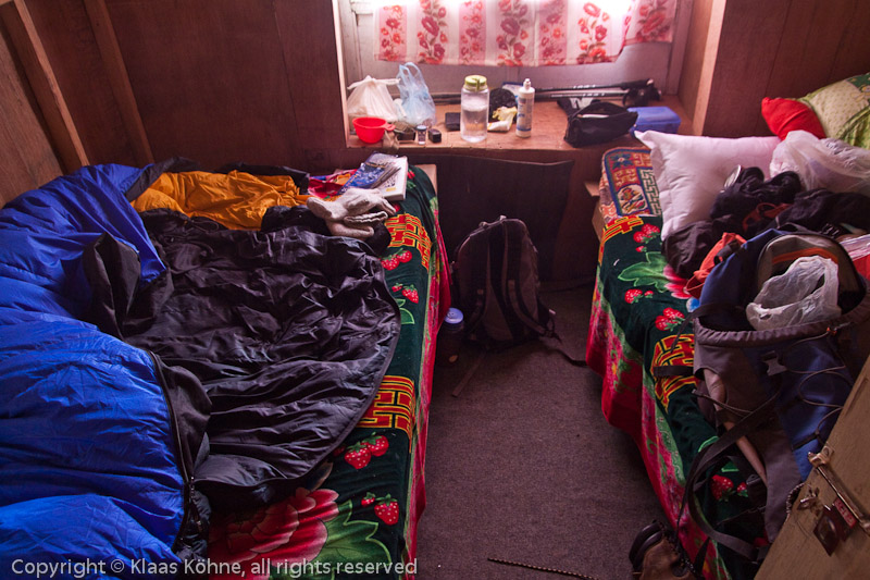 8.3.: Fast gepennt wie ein Stein. Auch wenn die Lodge ´ne ziemliche Bruchbude ist, verglichen mit einem Zelt ist das hier megaluxuriös. Heizung gibt´s im Zimmer natürlich nicht, deshalb sind die Linsen auch etwas eingefroren. Aber ich weiß ja, dass sie das aushalten.