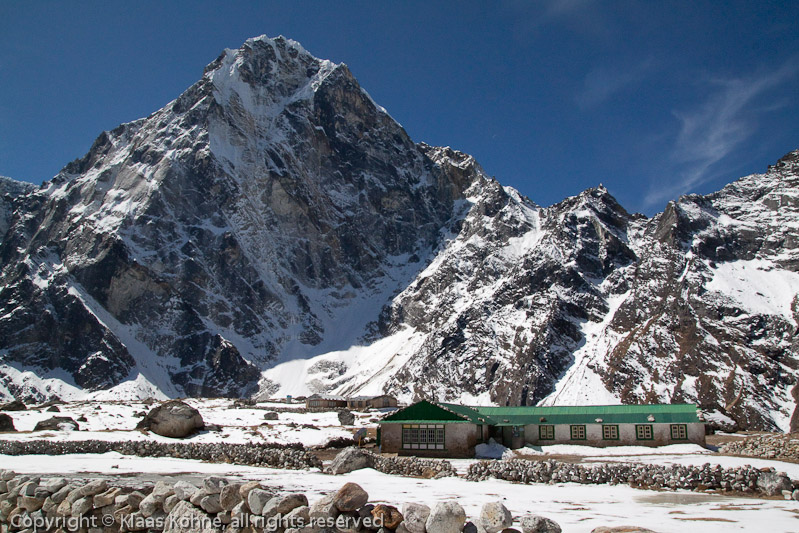 Die Lodges von Dzonglha unterhalb der riesigen Cholatse-Norostwand