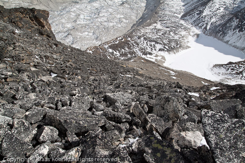 Kurz vor vier - es wird Zeit für den Abstieg. Erst vorsichtig über den Grat zum Vorgipfel, dann konzentriert das Blockfeld hinunter. Pole, pole!