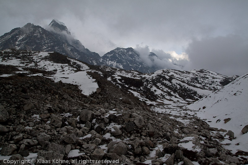 Es reißt wieder etwas auf. Nerviges Moränengestolpere. Es ist noch weit bis Gokyo...