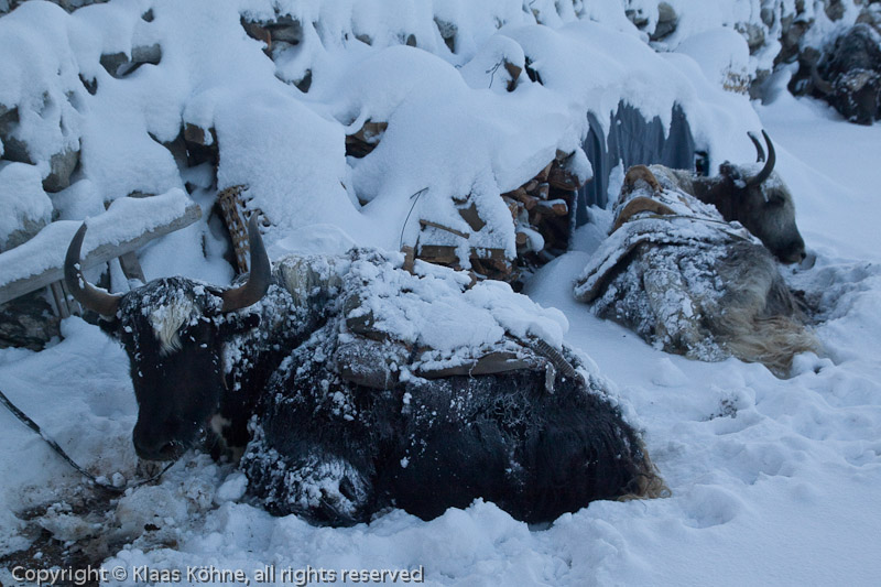 Die Yaks ertragen den Wintereinbruch mit ihrer ureigenen Gelassenheit.