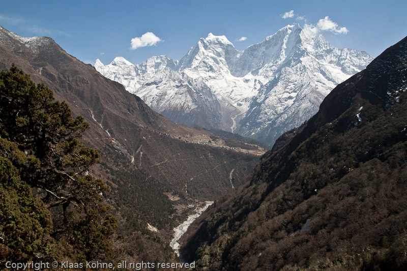 Blick talauswärts auf den Dudh Kosi und Phortse. Darüber Kangtega und Thamserku.