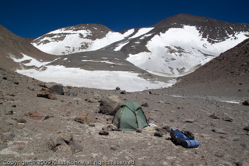 13.12.: The day after... Wache erst um 9 auf. Draußen ganz schön warm und ganz schön windig. Das Programm für heute ist klar: Back to El Arenal. Ich kann mit der Ojos-Aktion gestern immer noch nicht viel anfangen, ich traue mich ja nicht mal zu schreiben "Ojos-Besteigung". Sollte ich mich nicht irgendwie darüber freuen? Was soll ich sagen, wenn man mich fragt, ob ich oben war? "Ja, war ich!" oder "Naja, fast..." ? Wohl Letzteres. Es überwiegt der Eindruck, dass ich jetzt ein "statistisches Problem" habe. Verdammter Perfektionismus - wieder mal! Der Grat zwischen Beharrlichkeit und Starrsinn ist schmal. Werde wohl irgendwann nochmal von der chilenischen Seite raufgehen (müssen), um die Sache zu klären - ich kenn´ mich ja. Ob ich mich aktuell noch für den Cazadero zusammenreißen kann? Große Lust habe ich nach den vergangenen Tagen nicht, aber Zeit und Mampf sind da und vielleicht bereue ich es später, wenn ich jetzt aufgebe. Gleich 11. Ob ich´s denn mal so langsam packe? Erstmal vor die Tür gehen und dem Ruf der Natur folgen. Beim Blick auf den Berg wird mir klar, dass ich mir gestern abend ´nen schönen Verhauer geleistet habe! Jedenfalls gut, dass ich noch auf die Idee der Bachquerung gekommen bin. So, Sachen zusammenkramen und ab. Ich komme erst kurz vor halb 1 weg - ist aber egal heute.
