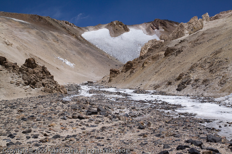 11.12.: Die achte Nacht im Zelt und wieder dauerte sie ewig lang. Dann wird es aber doch hell - gewonnen! Tja, was kann hierbleiben? Kocher, Topf, Gas, Mapf und die Steinproben. Den Rest nehme ich lieber mit. Weiß ja nicht, wie lange das da oben dauert. Eine gewisse Ojos-Anspannung ist da. Denn wenn der nicht klappt, werde ich die ganze Sache hier als Misserfolg verbuchen - ich kenn´ mich ja...
