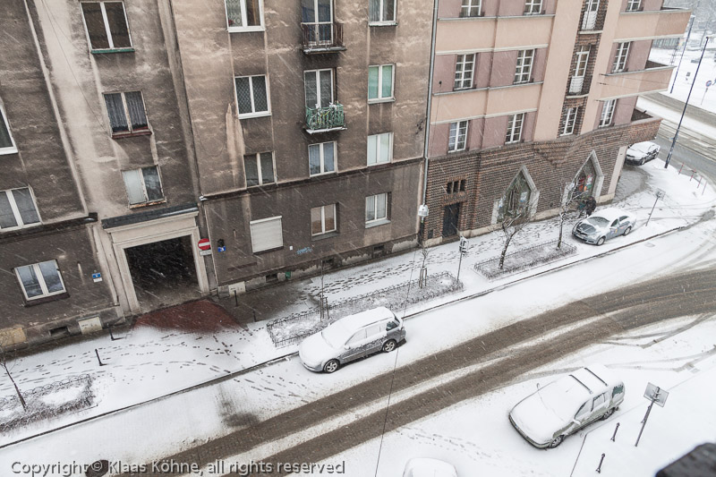 Der Blick aus dem Fenster unseres Hostels auf die ulica Pomorska (ulica = Straße)