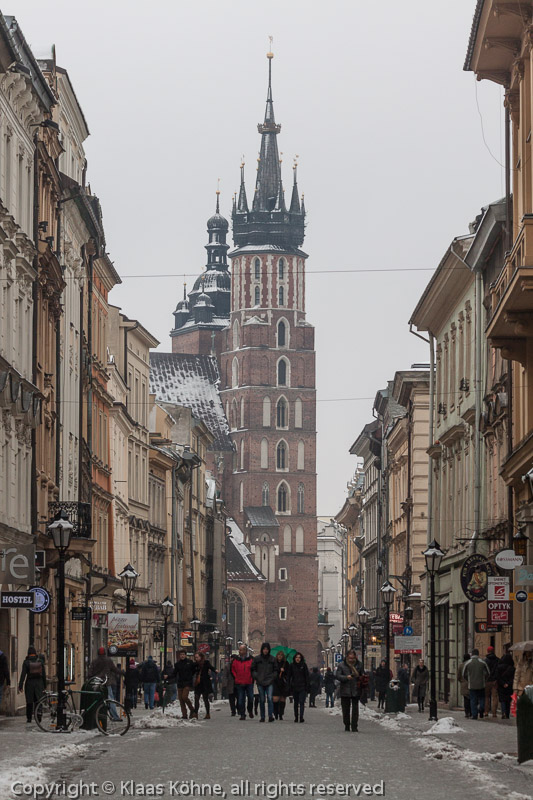 Die lange ulica Florianska mit Blick auf die Marienkirche. Die Florianska bildet einen Teil des sogenannten Königsweges (Droga Królewska), auf dem einst die königlichen Umzuge abgehalten wurden. Heute ist es eine elegante Shopping- und Flaniermeile.