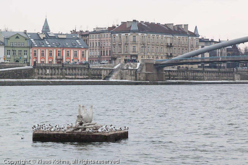 Seltsames "Arrangement" auf dem Wasser. Im Hintergrund Podgorze und rechts die "Kladka Ojca Bernatka". Sie ist auch als "Partybrücke" bekannt, weil sie die bei Nachtschwärmern beliebten Viertel Kazimierz und Podgorze verbindet.