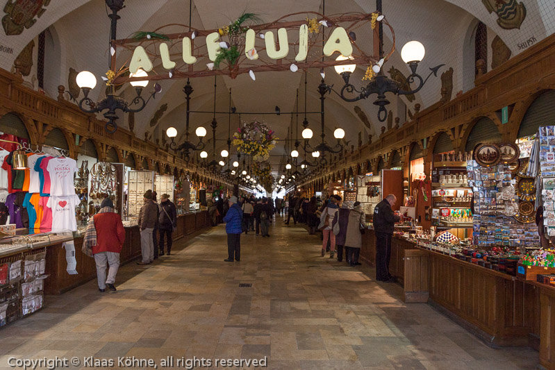 Verkaufsmeile in den historischen Tuchhallen (Sukiennice). Leider ziemlich viel Touri-Kram.