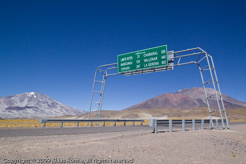 Wegweiser mit den Distanzen zu ausgewählten Städten in Chile. Im Hintergrund die mächtigen Vulkankegel von Incahuasi (6621m) und San Francisco (6018m). Wie immer begeistert mich der wunderbar klare Himmel in der Puna.