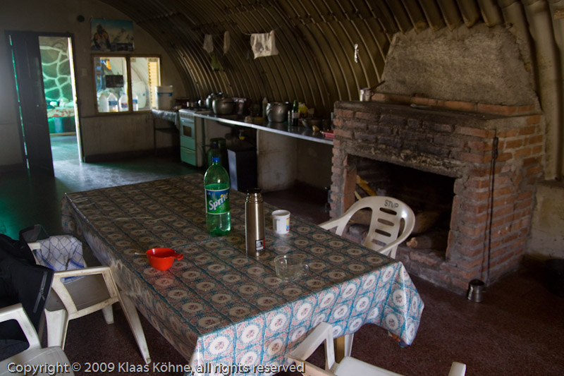 Zurück in Las Grutas. Der Speiseraum mit Herd und Kamin. Ein paar Tage kann man´s hier gut aushalten. Und bei den freundlichen Minenarbeitern nebenan kann ich sogar Real gegen Barca schauen. Schon erstaunlich, was heutzutage technisch möglich ist...
