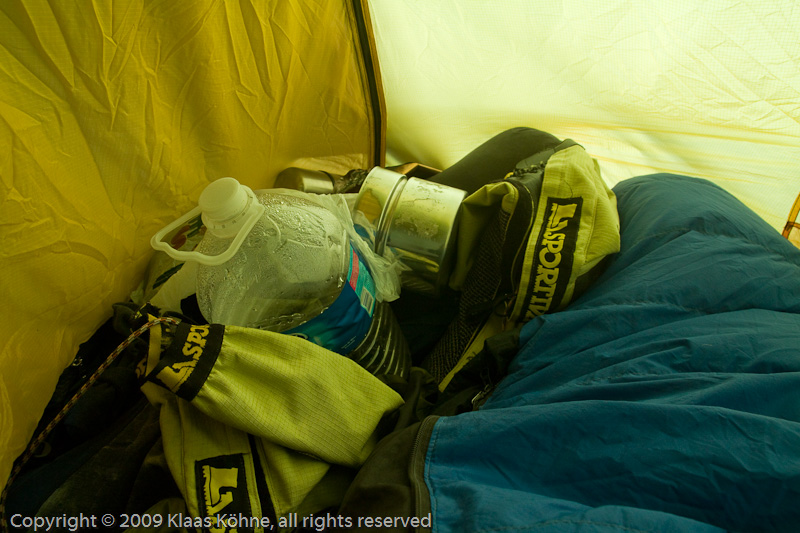 Um halb 6 bin ich wieder beim Zelt. Es steht zum Glück noch - "fluctuat nec mergitur". Sieht aber ganz schön zerzaust aus. Muss das Zelt nochmal neu mit Steinen abspannen. So, rein in die gute Stube. Wieder mal Kaltverpflegung. Zum Dinner wird der Marmorkuchen gekillt. Will versuchen, die Gaskartuschen möglichst lange zu schonen. Oh Mann, es wird immer stürmischer draußen...