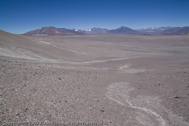 Blick zurück auf die "Llanos del Fraile" und die Vulkane in Chile