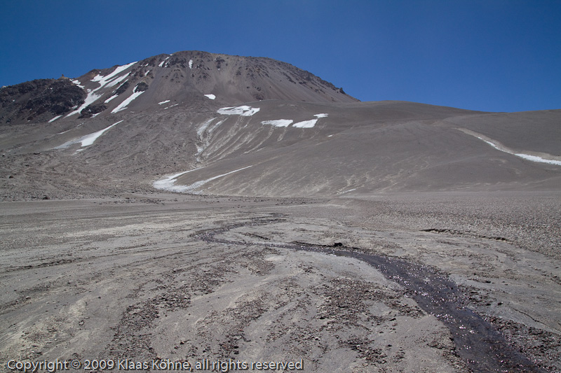 Relativ flach geht es von der Passhöhe abwärts. Oh, ein kleines Bächlein unterhalb des Fraile. Gleich mal etwas Wasser bunkern. OK, wenn ich das vorher gewusst hätte, hätte ich nicht soviel Wasser mitschleppen müssen. Aber sich auf sowas zu verlassen, kann auch ziemlich riskant sein.