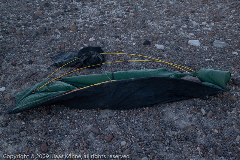 Aber es ist so stürmisch, dass ich am Zeltaufbau fast verzweifle. VERDAMMTER SCHEISSWIND! So, damit das mal gesagt bzw. geschrieen ist. Außerdem hat sich das Zelt übel vertoddert, was meine Laune nicht gerade hebt. Über eine Stunde dauert es, bis die Bude endlich steht. Bin extrem angenervt, obwohl die Landschaft und das Licht eigentlich wunderbar sind. Aber irgendwie kann ich das gerade nicht angemessen würdigen. Gehe nochmal raus und organisiere ein paar 10-Kilo-Steine, falls es in der Nacht und morgen so übel weiterstürmt.