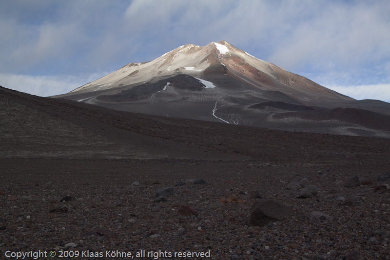So, da wären wir. Der Berg muss wohl nicht mehr vorgestellt werden. Für den Hinweg ohne Gepäck habe ich gut vier Stunden benötigt und jetzt für den Rückweg mit etwa 15kg nur ´ne halbe Stunde länger, tut also sich fast nix. Ich denke, die Strecke von Las Grutas bis hierher kenne ich jetzt in ausreichendem Maße. Mein Leben vor dieser Durchquerung hat sich ziemlich aus meinem Bewusstsein verflüchtigt, es geht fast nur noch um die vergangenen bzw. kommenden paar Tage. Dabei komme ich mir zunehmend vor wie im Käfig. Aber wenn ich noch auf den Ojos will (von anderen 6000ern ganz zu schweigen), dann muss ich dieses Gefühl aushalten. Bin mal wieder zu faul zum Kochen. Der linke große Zeh fühlt sich etwas taub an. Auweia, wahrscheinlich hab ich mir den leicht angefroren. Für diese Kombination aus Höhe und Sturm sind die Trekkingschuhe wohl doch nicht gemacht. Andererseits könnte ich die längeren Strecken auch nicht mit den Olympus Mons(-tern) gehen. Die sind nur für die Gipfeletappen. Naja, und außerdem hab ich natürlich längst nicht soviel getrunken, wie man in diesen Höhen trinken sollte. Draußen wird es immer stürmischer.