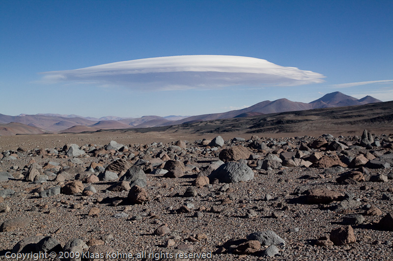 Blick nach Süden. Etwa dort wo die Wolke steht (die mich spontan an das Raumschiff im Film "District 9" erinnert), führt der Weg zurück in die Zivilisation entlang - aber das wird wohl noch mindestens eine Woche dauern... Natürlich ziehen sich die letzten Kilometer wieder übel hin. Um kurz nach halb 7 wieder beim Zelt. Die Stangen montieren, die Abspannungen (ab heute zwei weniger) fixieren und rein in die gute Stube. War mal wieder ein 10-Stunden-Tag, aber ich ich war ja auch prima ausgeruht nach der windstillen Nacht... Heute habe ich rund 16km zurückgelegt und dabei genau 5 Erdnüsse gegessen. Bin offenbar wieder mal im Energiespar-Modus. So, bevor die Dunkelheit kommt, wird noch eine kleine Windmauer (= pirca) errichtet. Macht richtig Spaß, jetzt noch dicke Steine zu schleppen. Also, dieser Sturm ist echt unglaublich. Es dauert über eine Stunde, bis ein kleiner U-Wall fertig ist.