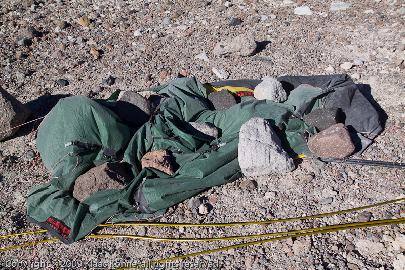 Tja, wie vor ein paar Tagen bin ich dann offenbar doch etwas eingepennt. Die Lage um kurz vor 7: Die Sonne scheint, das Zelt steht noch, mein Zeh scheint sich etwa berappelt zu haben - und es stürmt weiter wie Sau! Tja, que hacer? Kann ich noch eine dritte Nacht hier ertragen? Eigentlich will ich ja heute ein Depot auf halber Strecke nach El Arenal anlegen, 6 Stunden hin, 4-5 Stunden zurück. Dann müsste ich aber spätestens um 9 hier weg. Vorher muss aber das Zelt zusammengelegt und mit Steinen beschwert werden - mit schweren Steinen. Um zwanzig vor 9 komme ich los.