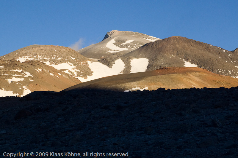 9.12.: Die Nacht auf 5480m war zwar windig, aber kein Vergleich zu den letzten Nächten. Der Ojos del Salado grüßt in der Morgensonne. Zum Glück keine Höhenbeschwerden. Die dürfte ich mir hier auch nicht erlauben. Eigentlich darf ich mir hier gar nichts an ernsteren Gesundheitsproblemen leisten. Wer weiß, wann hier mal wieder einer vorbeikommt. Heute ist Ruhetag, morgen wird´s dann nochmal fies, wenn ich das Depot hole, und dann kann ich an die Puna-Traverse einen Haken machen, endlich! Der Gedanke ist verführerisch, danach sofort Richtung Fiambalá aufzubrechen. In drei Tagen könnte ich da sein, wenn alles klappt. Andererseits will ich ohne Ojos-Gipfel hier nicht weg. Naja, heute also Wasser bunkern, Erdnüsse fressen und mal sehen, ob hier nicht doch noch andere Menschen sind. Blöd wäre natürlich, wenn jetzt ein Wettersturz käme und ich morgen nicht mehr an mein Depot rankönnte. Jedenfalls brauche ich diesen Ruhetag unbedingt. Es windet mal wieder heftig. Ich muss aufpassen, meine beiden Nalgene-Weithalsflaschen sehen sich derzeit SEHR ähnlich...
