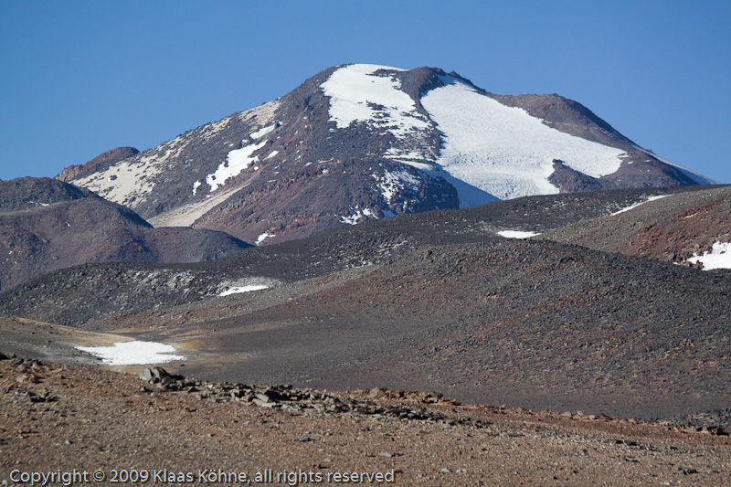 10.12.: Mittelprächtig gepennt, mal wieder wirre Hochlager-Träume... 6h40. Wenig glamouröse Aufgabe heute - aber es nützt ja nix. Also raus aus den Daunen. Um 7h21 geht´s los. Wind heute nur mäßig stark. Und (fast) ohne Gepäck macht es durchaus Spaß. Nur nicht an den Rückweg denken. Blick zum Muerto (6488m). Der ist auch für´s nächste Mal vorgemerkt...