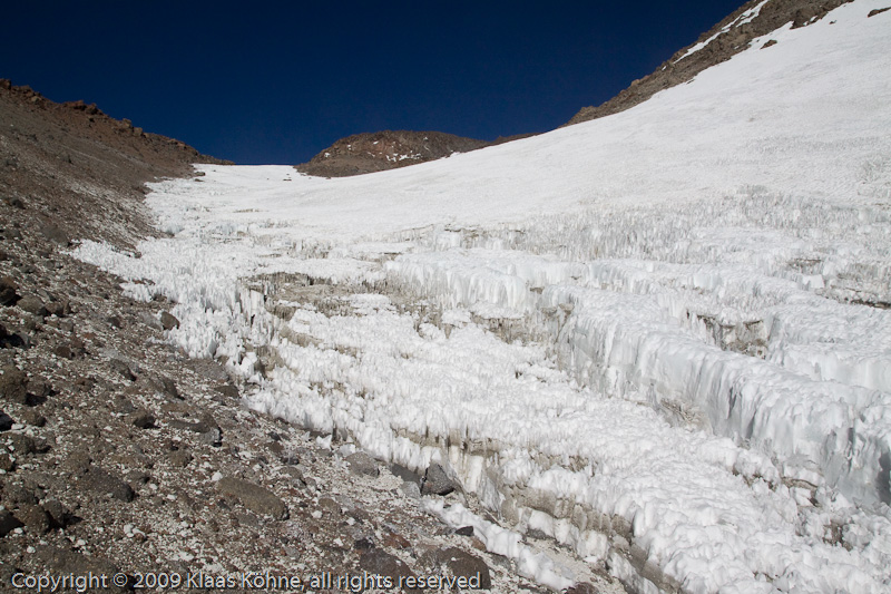 Ich passiere die 6000m-Marke, es geht voran. So, geradeaus oder rechts hoch? Die Karte sagt geradeaus. ´Ne halbe Stunde später das Gleiche, diesmal aber rechts hoch. Es wird steiler. Ich bin zu faul, mir die Steigeisen anzuziehen - es geht gerade noch ohne.