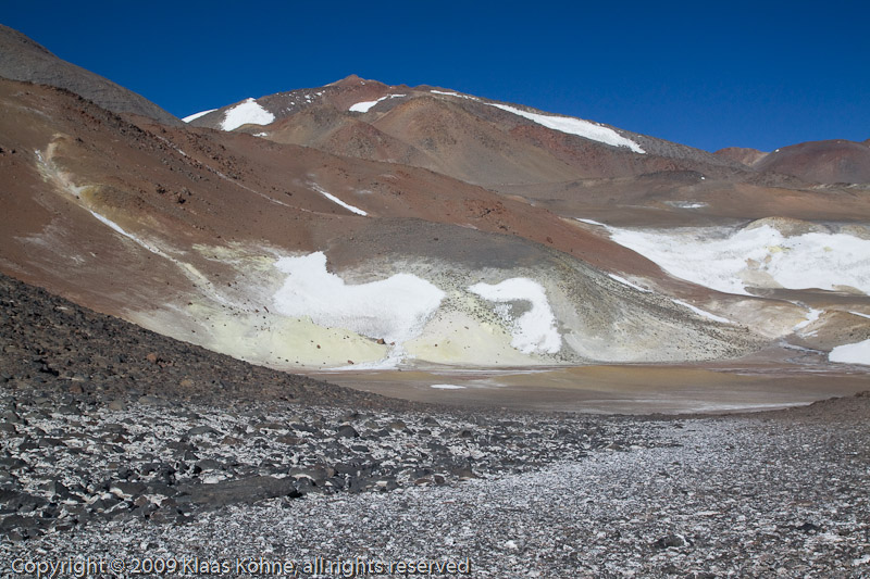 Nach einer Querung mit leichtem Höhenverlust erreiche ich das untere Ende der Schneezunge. Gegenüber buntgefärbte Hänge.