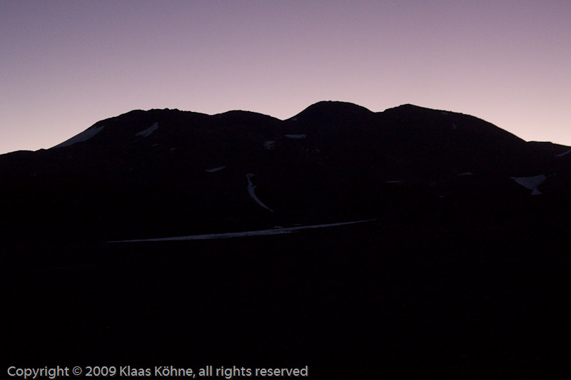 Die Silhouette des Cazadero. Nach kleineren Irrwegen und einem geringfügigen Penitentes-Problem (ohne das geht´s offenbar nicht) erreiche ich kurz vor halb zehn endlich mein geliebtes Basislager in El Arenal. Fast 15 Stunden unterwegs, 1200 Höhenmeter und gut 15km Wegstrecke - ein ausgefüllter Tag. Kein Triumphgefühl, aber durchaus eine gewisse Genugtuung - und bleierne Müdigkeit. Schön, dass es diesmal keine Zweifel gibt, ob ich wirklich am höchsten Punkt war. So, das war´s wohl mit den 6000ern. LInsen raus und in die Falle. Morgen auf den Medusa? Eher nicht, ich will nur noch zurück in die Zivilisation...