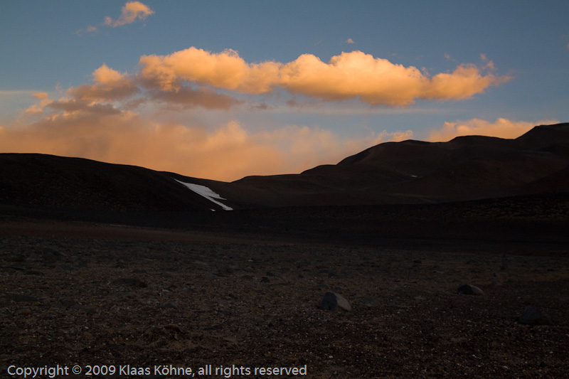 Der letzte Abend in El Arenal!? Einerseits wünsche ich mir nichts mehr, als endlich von hier wegzukommen und die Segnungen der Zivilisation zu genießen. Immerhin bin ich jetzt seit einer Woche permanent über 5300m, solo und bei begrenztem Komfort in jeder Hinsicht, das hinterlässt einfach Spuren. Wahrscheinlich ist dabei die psychische Erschöpfung noch deutlich größer als die physische. Aber auf der anderen Seite kriege ich schon jetzt sowas wie "melancholische Anwandlungen", dass ich morgen MEIN El Arenal verlassen werde. Erstaunlich, wenn ich bedenke, wie kaputt und genervt ich hier angekommen bin. Die Frage nach der Ursache meiner Magen-Darm-Probleme hat sich nach einer weiteren (kalten) Tütensuppe und teilweise hastigen vier Gängen nach draußen auch eindeutig geklärt. Am späten Abend hat sich die Situation dann wieder einigermaßen beruhigt. Ach ja, wenn man sich jetzt für ein paar Tage nach Fiambalá und danach wieder hierhin beamen könnte. Dann wären wohl noch ein paar Gipfel fällig (weather permitting). Aber so, wie es ist, kann es nur noch darum gehen, heile runter zur Straße zu kommen. Das wird schwer genug - buchstäblich...