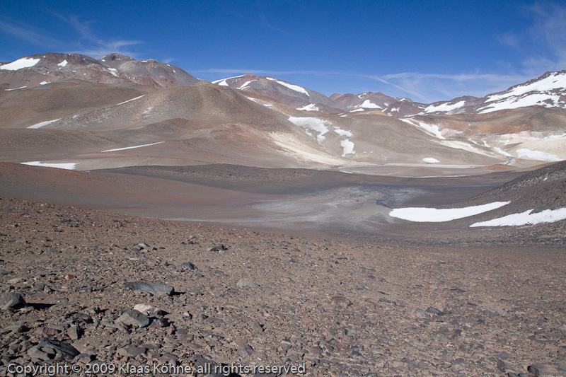 Zuerst geht´s den Hang hoch. Um kurz nach halb 10 ist der höchste Punkt (gut 5600m) erreicht. Blick zurück nach El Arenal - mit ziemlich gemischten Gefühlen. Hinten links der Cazadero.