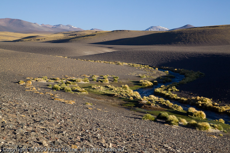 17.12.: Sehr gut geschlafen, endlich mal! Vogelgezwitscher zum Wecken, hatte ich ewig nicht... Ein wunderschöner Morgen: Blue Sky, Windstille, der idyllische Bach und am Horizont die Giganten der Puna. Rechts am Horizont Fraile und Negro. Ein Gefühl von "The war is over!" durchströmt mich. Es ist so schön hier, am liebsten würde ich den ganzen Tag hier verbringen. Naja, den ganzen vielleicht nicht, aber diese Stimmung möchte ich schon noch etwas auskosten. Muss ja auch nicht unbedingt heute schon in Fiambalá sein. Dafür ist es wahrscheinlich eh zu weit. Ich könnte mich wohl bis heute abend zur Straße kämpfen, aber ob mich dann noch jemand mitnimmt, ist sehr fraglich. Also erstmal den schönen Morgen hier genießen...