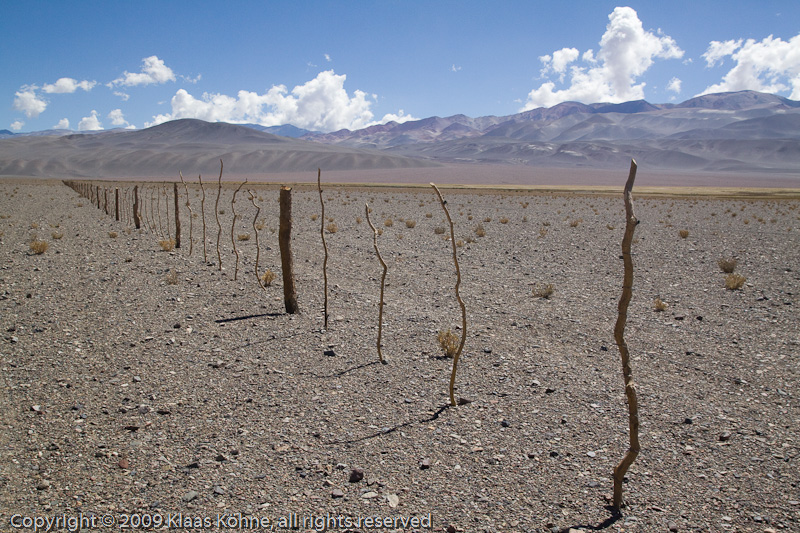 Tja, von wegen! Wäre ja auch zu schön gewesen, wenn es keine Hindernisse mehr gegeben hätte. Aber so, wie sich die Tour entwickelt hat, kann mich dieser Zaun kaum noch überraschen. Meine Gedanken gehen eher in die Richtung: "Na toll, da habt ihr euch ja wieder was Feines ausgedacht!" Der Zaun umschschließt offenbar ein weites Areal, ich muss also drüber klettern. Also erst den Rucksack rüberwuchten und danach mich selbst. Nicht schön, aber irgendwie gehts - natürlich nicht ohne herzhaftes Fluchen...