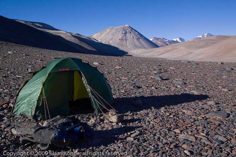 Zeltlager am Inchuasi-Pass auf etwa 4900m. Im Hintergund der Vulkan El Fraile (6061m).