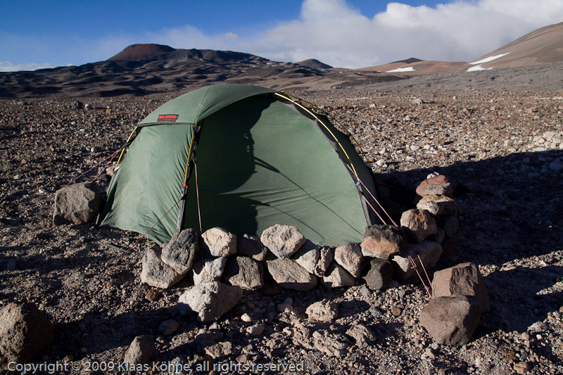 Zeltlager unterhalb des Fraile-Passes auf 4970m mit selbstgebauter Windmauer. Auch diese Nacht war wieder sehr stürmisch.