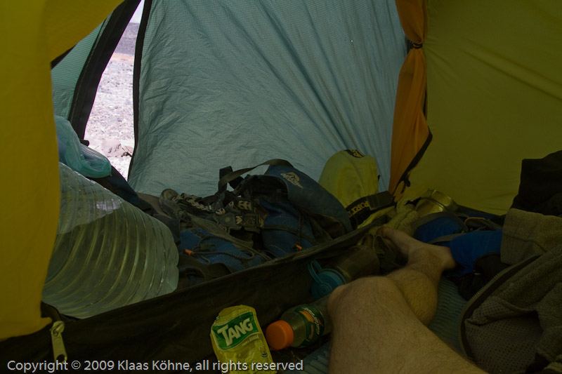Ruhetag im Lager von El Arenal auf 5480m. Wenn die Sonne rauskommt, wird´s im Zelt mollig warm.