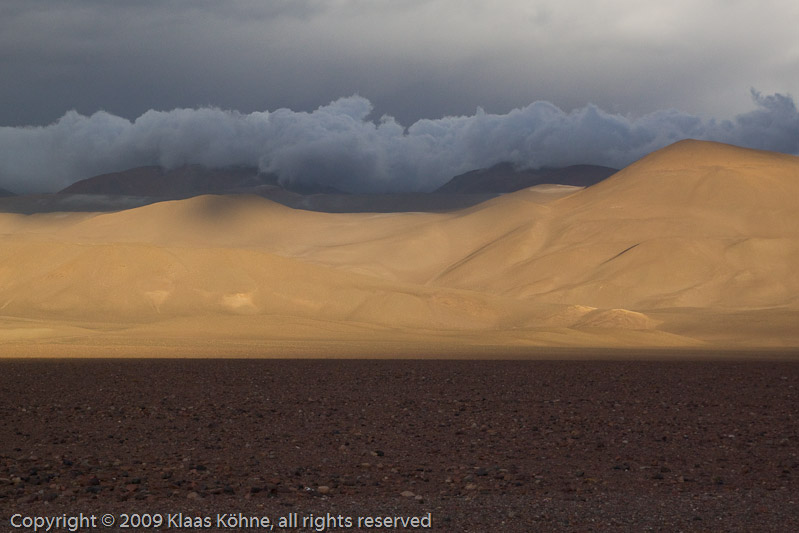 Um zwanzig nach sechs kommt mal wieder ein Auto und hält. Es ist aber auch proppevoll. Sie fragen mich, ob sie in Fiambala Bescheid sagen sollen, dass mich jemand abholt. Hm, ich bin hin und hergerissen. Wenn ich ja sage, dann a) kostet mich das ´ne Stange Geld, b) dauert es dann bestimmt noch bis zehn Uhr, bevor ich wegkomme, c) ist ja gar nicht sicher, dass mich dann jemand abholt und d) kommt garantiert in zwei Minuten ein Auto, das mich kostenlos mitnimmt, aber wenn ich nein sage, verbringe ich wahrscheinlich noch drei Nächte hier. OK, sie sollen Bescheid sagen - ich will einfach weg hier! Auch wenn die Lichtstimmung wieder mal toll ist.