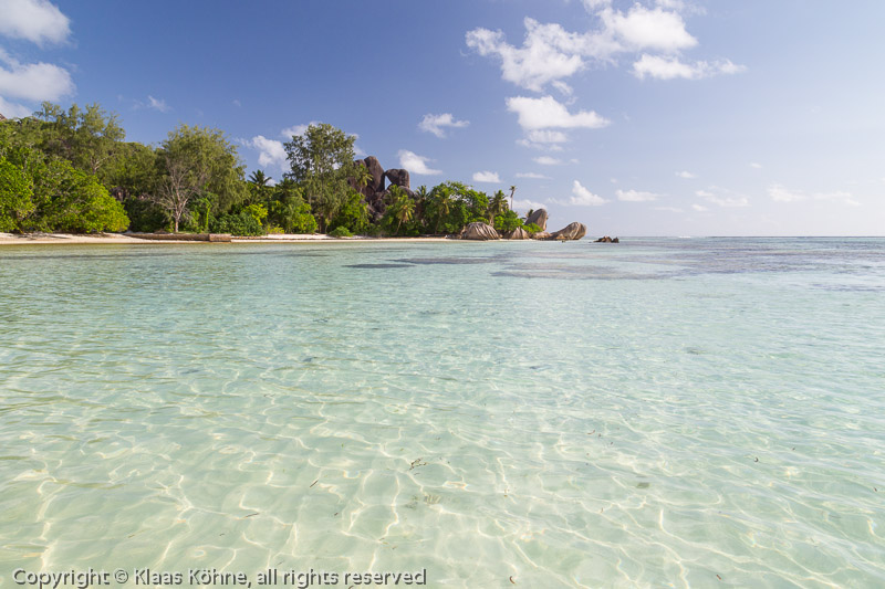 Da hinten sind die berühmten "Postkartenfelsen" der Anse Source d´Argent.
