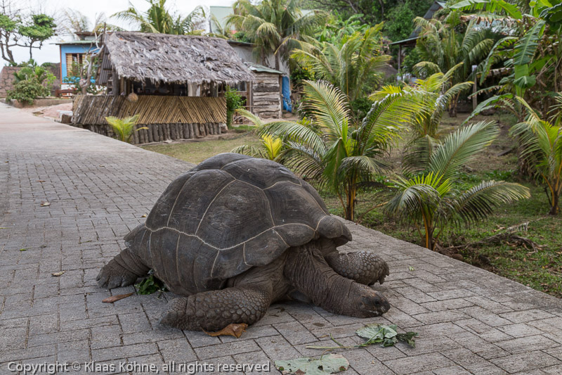 Wir radeln um die Nordspitze der Insel und treffen auf diesen alten Einheimischen. Vielleicht ist es auch eine Lady. Jedenfalls lässt er/sie sich durch uns nicht im geringsten aus der Ruhe bringen. Es müsste sich um eine Aldabra-Riesenschildkröte (Aldabrachelys gigantea bzw. Dipsochelys dussumieri) handeln, die auf La Digue eigentlich schon ausgestorben ist. Dies ist vermutlich ein Importexemplar von einer anderen Insel. Über 250 Kilo können die Tiere auf die Waage bringen. Sehr beeindruckend, diese Begegnung!
