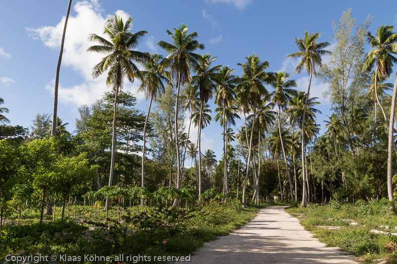 Blauer Himmel am nächsten Morgen. Die schönen Kokospalmen gehören zur Plantage der ehemaligen Koprafabrik L´Union, die heute eine Touristenattraktion ist. Ich bin mit dem Radl unterwegs zu einem der berühmtesten Strände der Welt...