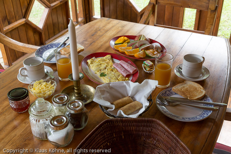 So, erstmal frühstücken! Die Tochter des Hauses bringt uns die Sachen jeden Morgen vorbei - SEHR praktisch!