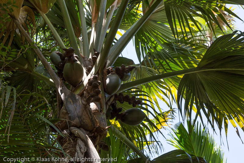 Die Coco de Mer ist viel größer als eine normale Kokoksnuss und kann bis zu 42kg wiegen. Sie ist die größte Nuss der Welt. Ihren Namen bekam sie, weil man sie lange nur auf dem Meer treibend oder angespült an Küsten sichtete. Bis 1768 wusste niemand, wo die Nuss eigentlich wächst. Die Palme kam ursprünglich nur auf zwei Inseln der Seychellen (Praslin und Curieuse) vor. Früchte tragen nur die weiblichen Pflanzen und die innere Schale der Nuss sieht auch definitiv weiblich aus! Einfach mal "Coco de Mer" googlen...