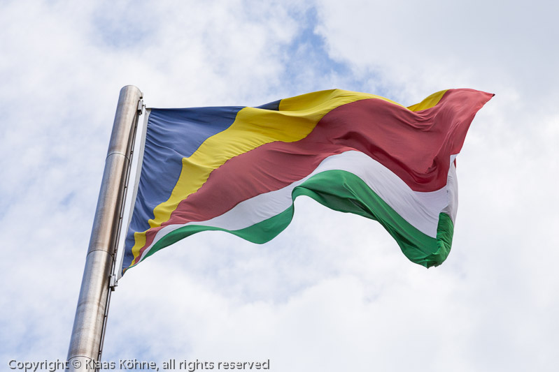 Die Flagge der Seychellen: Blau symbolisiert den Himmel und das Meer, Gelb die Sonne, Rot das Blut des Volkes, Weiß die soziale Gerechtigkeit und Grün die Vegetation.