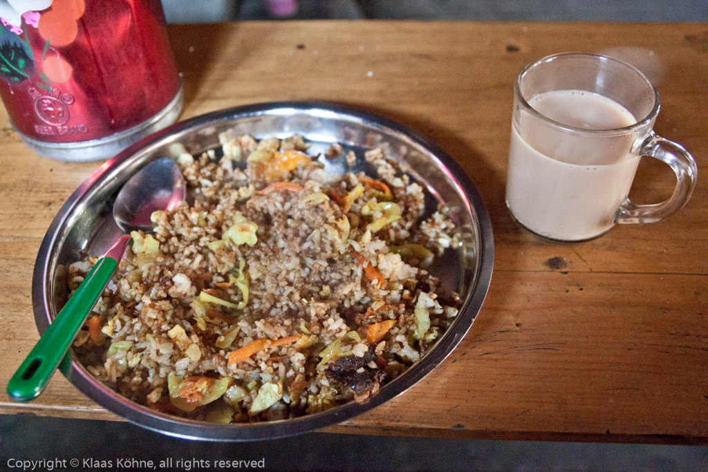 Milktea und "Egg-Vegetable-Fried-Rice", Taktor (Nepal)