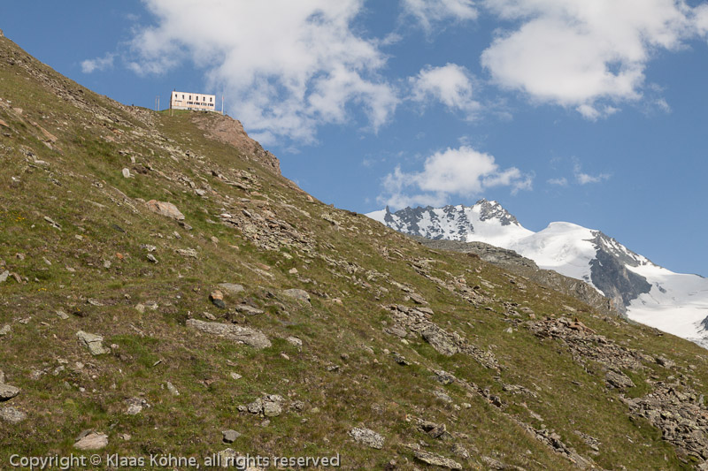 Weit oben thront die Täschhütte. Im Hintergrund das Rimpfischhorn (4199m).