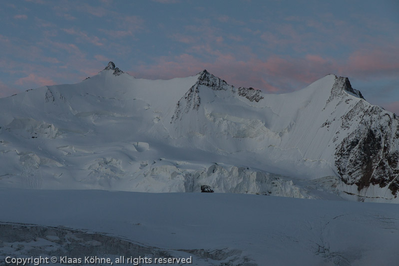 Jetzt mit etwas mehr Licht. Links das Nadelhorn (4327m), dann das Stecknadelhorn (4241m) und rechts das Hoberghorn (4219m). Bis zum Nadelhorn wollen wir heute eigentlich noch kommen, das wird aber vermutlich sehr knapp...