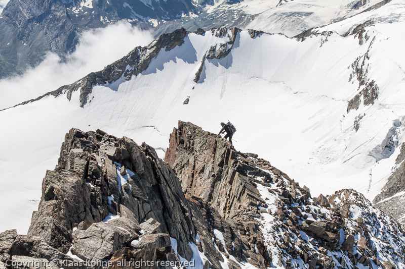 Erst um kurz nach zehn erreichen wir den Hauptgipfel des Balfrin (3796m). Danach muss wieder über Felsen abgestiegen werden. Das Gelände ist aber einfacher als beim Abstieg vom Bigerhorn.